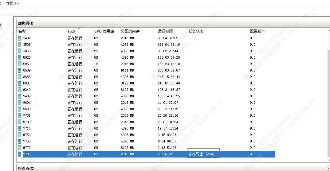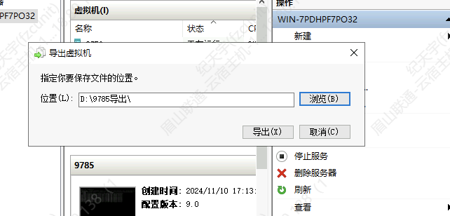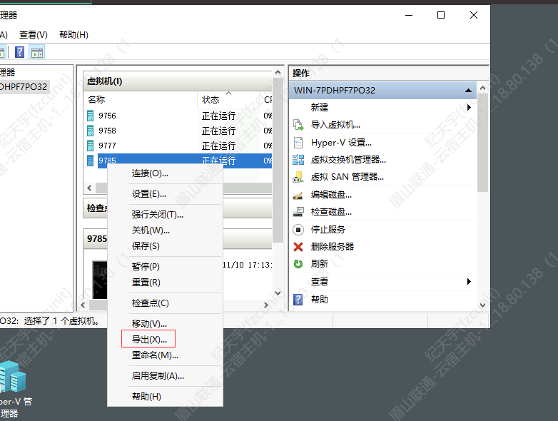 5.打开Hyper-V管理器,找到刚刚的虚拟机ID,右键,导出,并选择保存位置(位置不能选C盘,可以找个容量比较大的盘,目录需要自行创建,比如本次操作是在D盘创建了一个"9785导出"的目录)