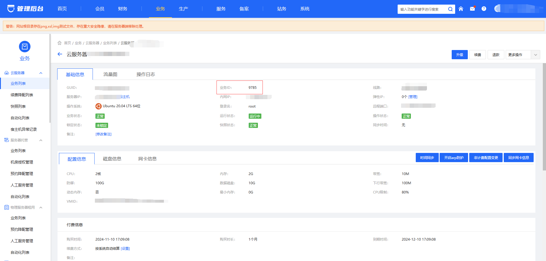 1.进入阿帕云管理后台,搜索相应业务,找到服务器列表,搜索服务器,找到服务器详情,记录业务ID(如图: 9785)