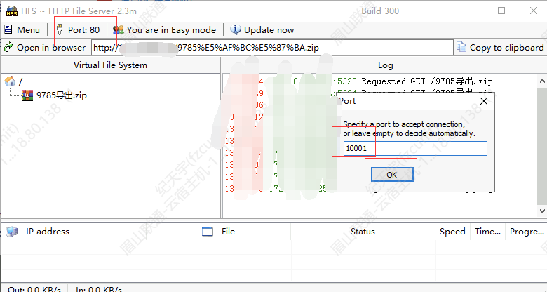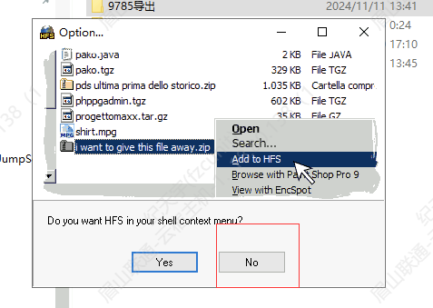 7.压缩完成后打开桌面的HFS工具,将压缩包拖入即可(如果有提示一概选择NO)