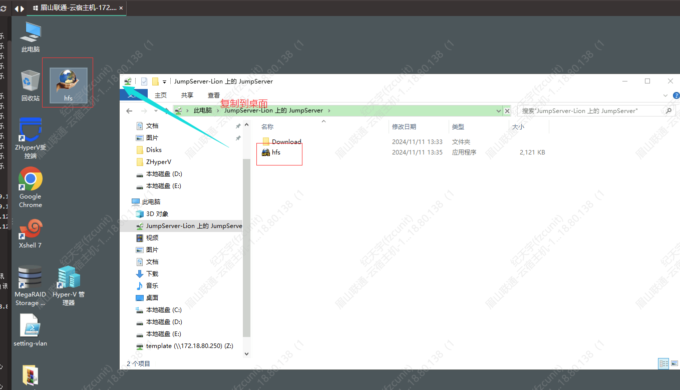 上传完毕后打开宿主桌面的"此电脑",找到JumpServer开头的共享,并点进去,复制HFS工具到桌面